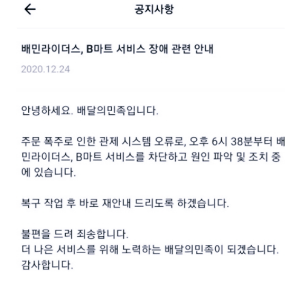 배민 운영사인 우아한형제들은 이날 애플리케이션(앱) 공지사항을 통해 “배민 라이더스와 B마트 주문이 24일 저녁 6시 38분부터 4시간 동안 장애가 발생했다”며 “원인을 파악해 정상화했지만, 라이더와 B마트 이용객에게 큰 불편이 생겼다”라고 밝혔습니다.
