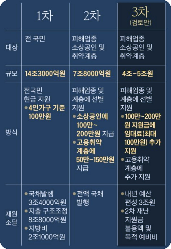 3차 재난지원금 지급 규모는 당초 내년도 예산 책정 시의 ‘3조원 + α(알파)’에서 4조 원을 훌쩍 넘길 전망이며 재원은 내년 예산에 편성된 3조 원에 2차 재난지원금으로 다 쓰지 못한 5000억 원, 목적 예비비 등으로 조달할 계획입니다.