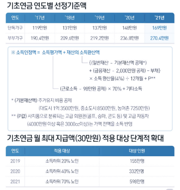 2021년도에 인상한 최저임금(2020년 8590원→2021년 8720원)을 반영해 근로소득 공제액도 기존 96만 원에서 98만 원으로 상향 조정해 일하는 노인들이 기초연금을 못 받는 일이 발생하지 않도록 했습니다.