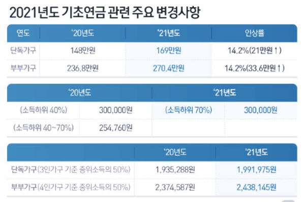 기초연금 수급 기준은 단독가구의 경우 지난해 148만 원에서 14.2% 인상한 169만 원, 부부가구는 전년 236만 8000원에서 14.2% 오른 270만 4000원입니다.