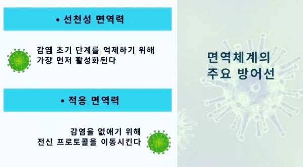 인간과 다른 척추동물은 감염됐을 경우 활성화되는 두 가지 주요 방어선이 있습니다. 선천성 면역력과 적응 면역력입니다. 두 가지 모두 병원균을 처리하는 특정 타이밍이 있는데 선천성 면역력은 감염 초기 단계를 억제하기 위해 가장 먼저 활성화되며 선천성 면역력이 제 기능을 하지 못하면 적응 면역력이 감염을 없애기 위해 전신 프로토콜을 이동시킵니다.