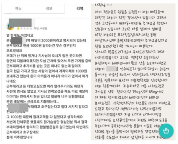 리뷰에서 작성자 A씨는 별점 하나를 주며 "별 한 개도 아깝다. 지역 배달비 2000원이라고 돼 있는데 군부대라고 현금 1000원을 달라는 것은 무슨 경우인지 모르겠다"며 "부대가 오기 힘든 곳이라면 (추가 배달비를) 지불해야겠지만 도심 근처에 있어서 주변 가게 중 군부대라고 추가 비용 받는 곳은 없다. 군부대라고 돈 더 받고 싶으면 미리 알려 달라. 1000원 때문에 잠재고객 다 잃었은 것"이라고 비난했습니다.
