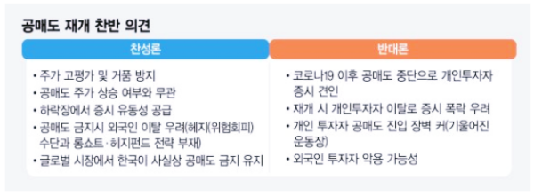 오는 3월 16일 재개되는 공매도를 놓고 찬반 논란이 거셉니다. 개인투자자들이 공매도 시장은 개인들이 당할 수밖에 없는 구조라며 재개를 강하게 반대하고 있습니다. 그러나 금융당국은 순기능을 무시할 수 없다며 재개에 대한 입장을 고수하면서도 개인투자자들과 정치권의 재검토 압박에 고민이 깊어지고 있습니다.