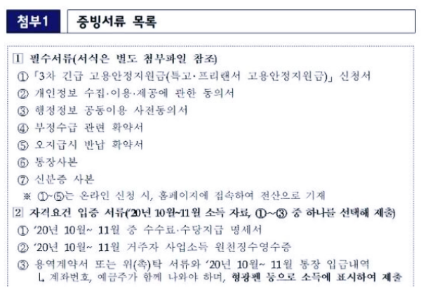 긴급 고용안정지원금은 Δ필수서류 Δ자격요건 입증서류 Δ소득요건 입증서류 Δ소득감소 입증서류 등 크게 4가지 서류를 준비해야 합니다.