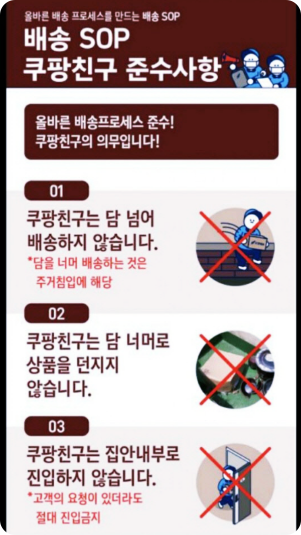 쿠팡이 이 같은 배송 SOP를 내려보낸 건 지난 15일 오후 늦게 보도된 사건 때문입니다. 이날 한 방송에는 지난 6일 낮 광 주 남구에서 쿠친의 유니폼인 파란색 조끼를 입은 남성이 여성 고객의 집 담을 넘다가 현장에서 적발돼 경찰이 수사에 나선 일이 보도됐습니다.