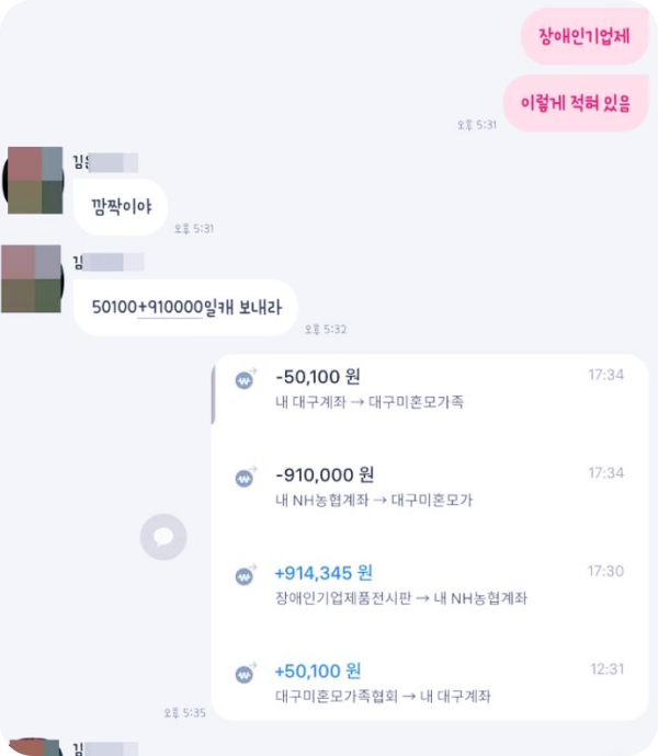 아임맘 전 직원 A 씨는 과거에도 물품 판매 대금이 오갔다며 관련 통장 사본을 제시했습니다. 홍보관을 운영하는 장애인단체가 A 씨에게 물건 대금을 이체하면, A 씨가 이를 다시 대구미혼모협회(아임 맘) 명의 통장으로 이체하는 식이었습니다. 지난 2019년 9월 30일과 10월 31일 두 차례에 걸쳐 각각 91만 원과 65만 원이 이체됐습니다.