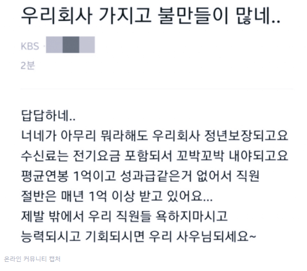 글쓴이는 “너네가 아무리 뭐라 해도 우리 회사 정년은 보장된다. 수신료는 전기요금에 포함돼서 꼬박꼬박 내야 한다”며 “평균 연봉 1억이고 성과급 같은 건 없어서 직원 절반은 매년 1억 이상 받고 있다”라고 말했습니다.