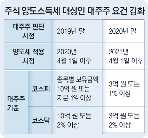 정부안에 따르면 올해 말 주주 명부 폐쇄일을 기준으로 내년 4월에 부과하는 양도소득세 대상 기준은 종목당 보유 주식 가치 10억 원에서 3억 원으로 대폭 낮아진다고 합니다.