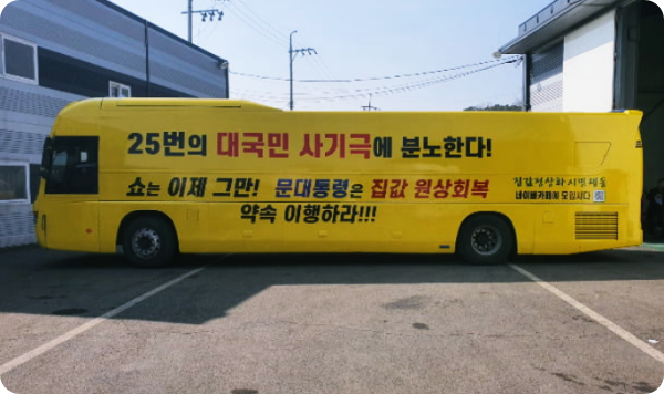 시민들의 모임인 '집값 정상화 시민행동'은 11일 "내달 9일까지 30일간 문재인 정부의 집값 폭등 정책을 규탄하고 집값 하 락 정책 실행을 촉구하는 버스광고를 실시한다"라고 밝혔습니다. 이 버스는 서울 곳곳을 누비며 서울시민에게 문재인 정부와 여당의 부당한 집값 정책, 이로 인한 집값이 폭등한 사실을 알릴 예정입니다.
