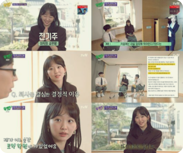 이후 유년 시절부터 꿈꿨던 기자라는 직업을 갖게 되고 '진기주 기자'라고 불리는 게 너무 뿌듯하다고 느꼈지만 막상 힘 든 수습 기간을 겪게 되니 '내가 이걸 하려고 그때 대기업을 힘들게 그만둔 게 아니었는데'라는 생각이 들어 3개월 만에 다시 퇴사를 결심했다고 밝혔습니다.