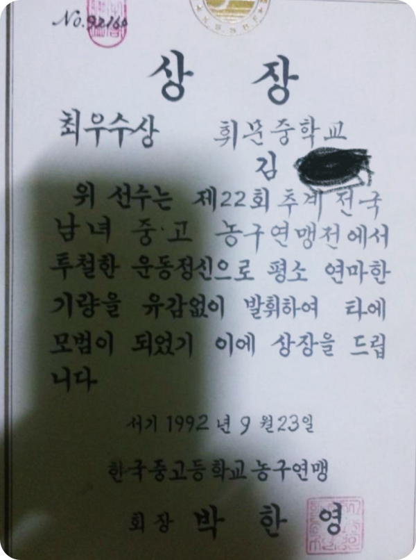 이와 함께 A씨는 자신이 중학교 시절 받은 상장을 인증했는데, 해당 상장에는 '휘문중학교'가 적혀있었기에 H 씨의 정체는 현주엽이 아니냐는 추측이 이어지고 있습니다. 특히나 그의 어머니가 국가대표 농구선수였던 홍성화 씨였기에 H 씨의 정체는 사실상 현주엽으로 굳어지는 상황입니다.