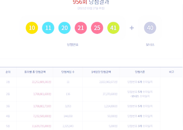 3월 27일 제956회 로또 당첨번호 추첨 결과 1등 당첨번호는 '11,25,41,20,10,21'이고, 2등 보너스 번호는 '40'입니다.