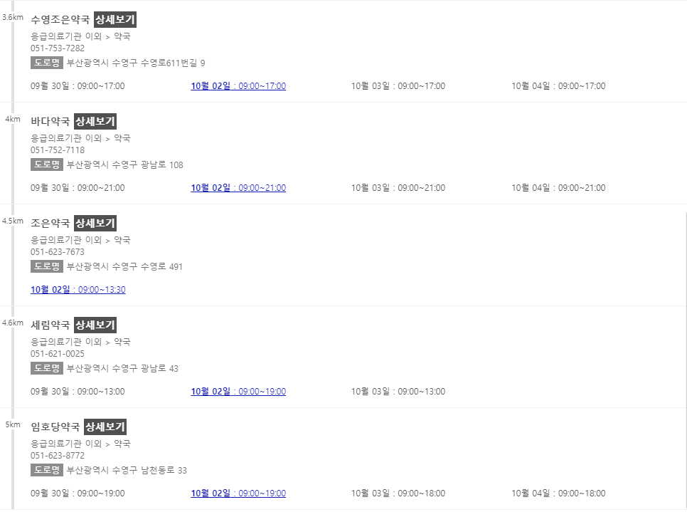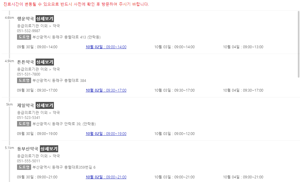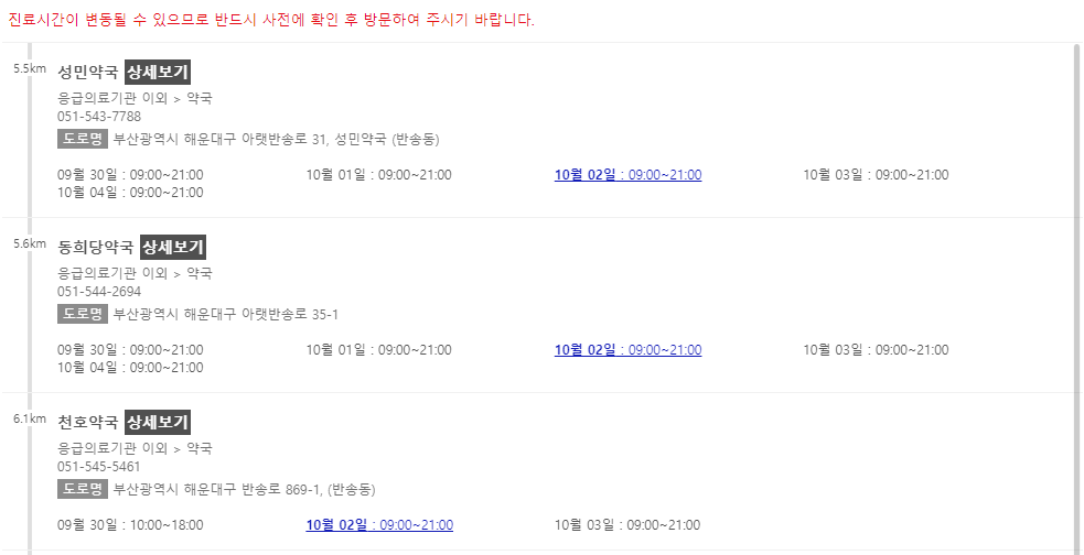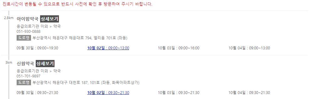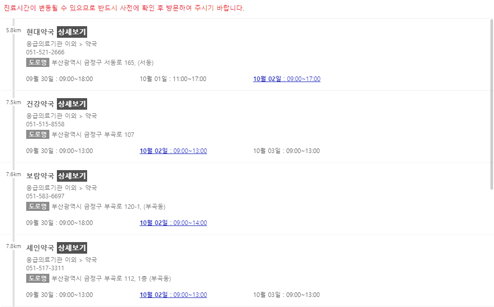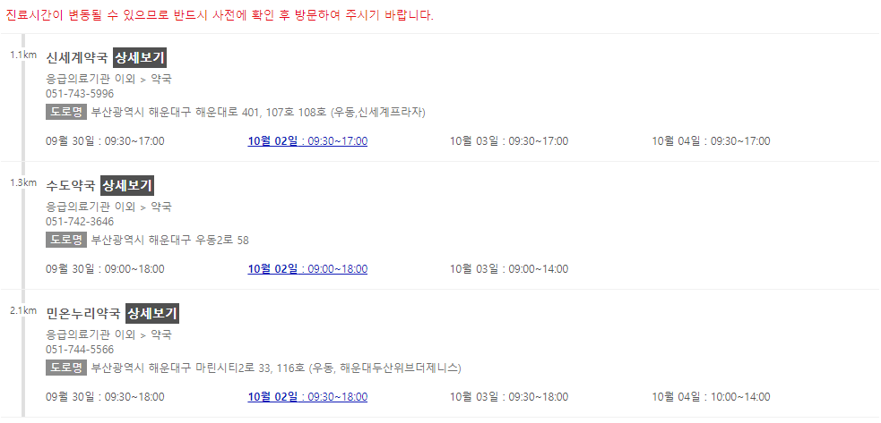 이 포스팅 이후에 차례로 부산 지역에서 추석 연휴에 문을 여는 약국들을 나열해 놓을 예정이니 참고해주시면 감사하겠습니다.