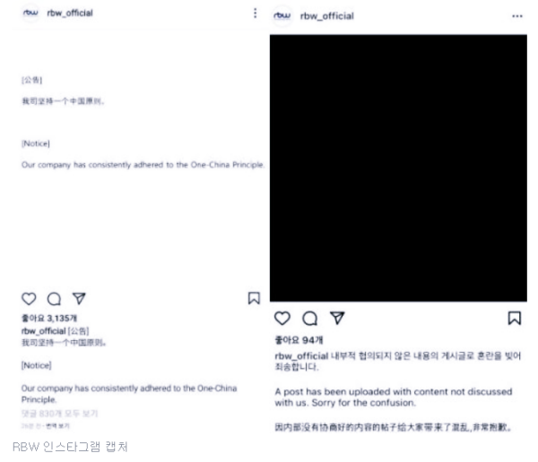 RBW 공식 인스타그램 및 웨이보에는 31일 “우리 회사는 ‘하나의 중국’ 원칙을 고수한다”는 글이 영어와 중국어로 게시됐습니다.