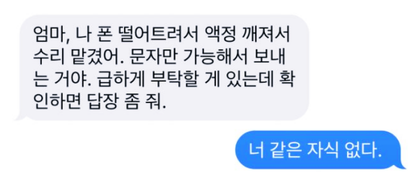 엄마를 찾는 문자가 왔다. 딸 번호가 아녔으나 설명이 있었다. 핸드폰을 떨어트렸다고, 액정이 깨져서 수리를 맡겼다고. 심지어 말투도 딸과 비슷해서, 별다른 의심을 안 했다고 했다. 어쩌다 떨어트렸냐고, 걱정하며 답장을 했다. 그러니 상대방은 본색을 드러내기 시작했다. 급히 수리비를 결제해야 하는데 카드 앞뒤를 찍고, 신분증 사본도 보내달라고 했다.