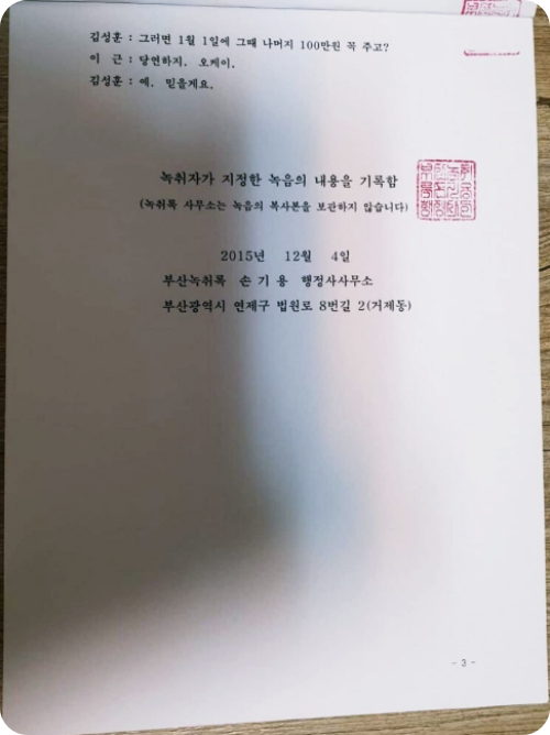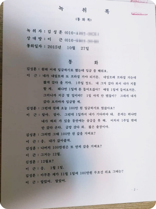 스카이다이빙을 그만둔 뒤 2015년 10월 27일에 통화했고, 나중에 그걸로 손기용 행정사사무소에서 녹취록(통화록)을 만들었습니다. 이 통화에서 200만 원을 11월 1일에 변제하기로 약속합니다. 200만 원은 절대로 이자를 붙인 금액이 아닙니다.