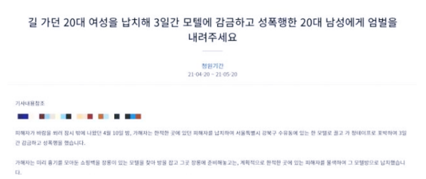 지난 20일 청와대 청원 게시판에는 '길 가던 20대 여성을 납치해 3일간 모텔에 감금하고 성폭행한 20대 남성에게 엄벌을 내려주세요'란 제목의 글이 게재됐으며 해당 청원은 아직 비공개 상태입니다.