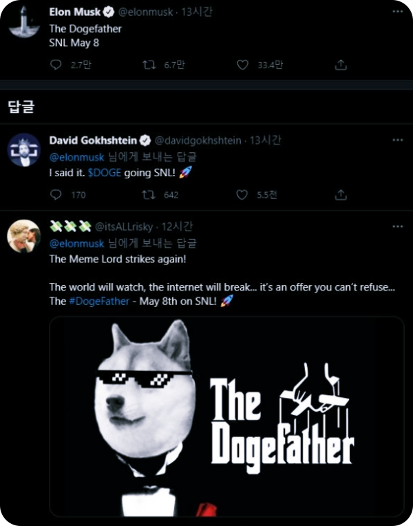 도지파더는 '도지 코인의 아버지'란 뜻으로 추정되며 'SNL 5월 8일'은 머스크가 진행자로 등장할 예정인 미국 NBC 방송의 인기 코미디쇼 새터데이 나잇 라이브(SNL)의 출연일을 가리킨 것으로 풀이됩니다.