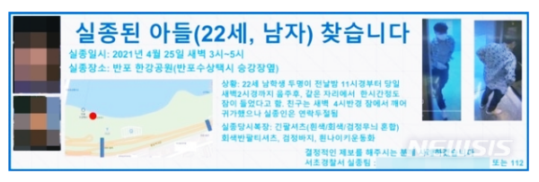 서울 사립대 의대 재학생으로 알려진 A씨는A 씨는 토요일인 지난달 24일 오후 11시께 친구를 만난다며 집 근처에 있는 반포한 강공원으로 향했고 A 씨는 실제 친구를 만나 술을 마셨지만 다음 날 종적이 묘연해졌습니다.