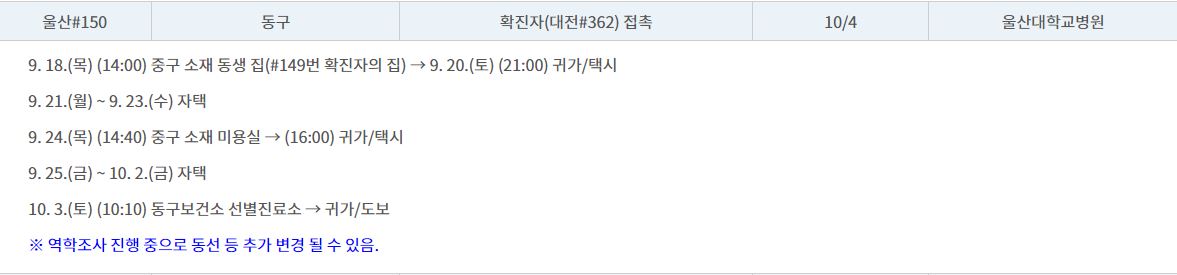 1. 울산 150번 확진자 이동동선
