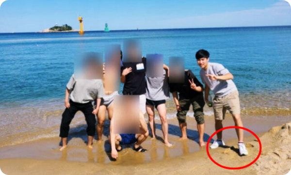 공개한 사진은 정민씨가 친구들과 함께 바다를 배경으로 모래사장에서 찍은 단체사진이며 손 씨의 말대로 친구들은 모두 맨발 혹은 샌들만 신은 채 물웅덩이에 발을 담갔고 정민 씨 홀로 양말과 운동화를 신은 채 모래를 밟고 서있습니다.