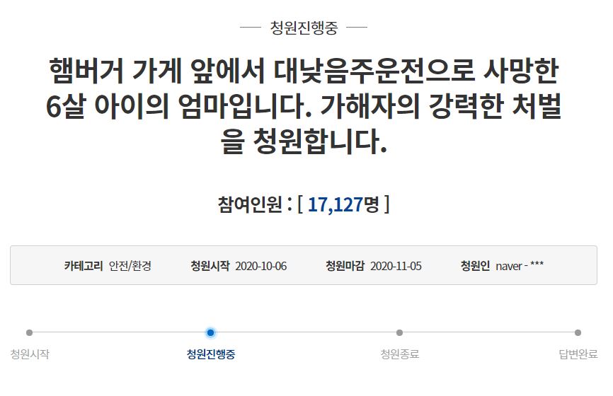 지난 6일 청와대 국민청원 게시판에는 "햄버거 가게 앞에서 대낮 음주운전으로 사망한 6살 아이의 엄마입니다. 가해자의 강력한 처벌을 청원합니다"라는 국민청원이 게시돼 하루 만에 1만 6000여 명의 동의를 얻었습니다.
